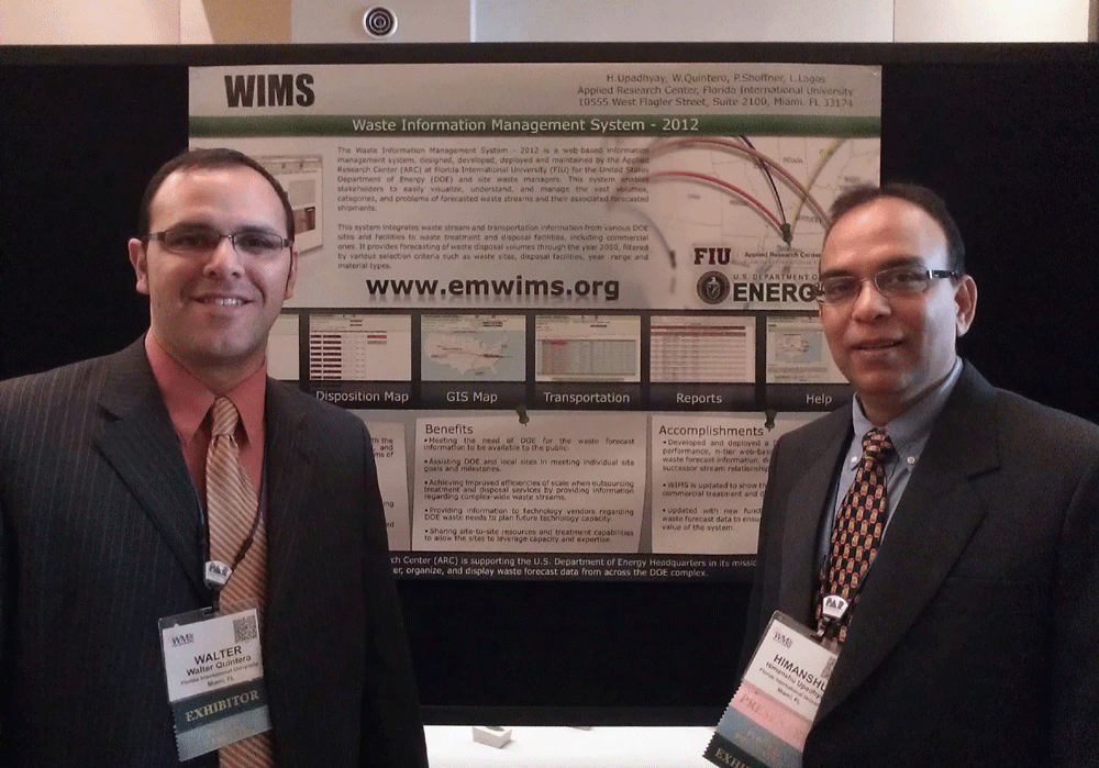 05. Himanshu Upadhyay and Walter Quintero presented the Waste Information Management System -2012 during a poster session at the conference. WIMS 2012 has been developed by the Applied Research Center at Florida International University to provide DOE Headquarters and DOE site waste managers with the tools necessary to easily visualize, understand, and manage the vast volumes, categories, and problems of forecasted waste streams. WIMS can be accessed at www.emwims.org.