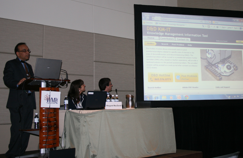 03. Himanshu Upadhyay presented the D&D Knowledge Management Information Tool – 2012 to a live audience at the Waste Management conference. D&D KM-IT web and mobile systems generated a lot of interest in the D&D community when presented to the conference participants which included U.S. and international attendees. D&D KM-IT is a web-based knowledge management tool, custom built for the D&D user community. The system has been developed by the Applied Research Center at Florida International University in collaboration with the U.S. Department of Energy’s Office of Environmental Management, the Energy Facility Contractors Group (EFCOG) and the ALARA Center at Savannah River Site. The web system can be viewed at www.dndkm.org and the mobile version can be seen at http://m.dndkm.org.