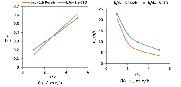 ">Comparison of theoretical correlations (Poreh) and CFD predicted values for maximum radial wall jet velocity (Um) and jet thickness δ variation along the radial direction (r/b)